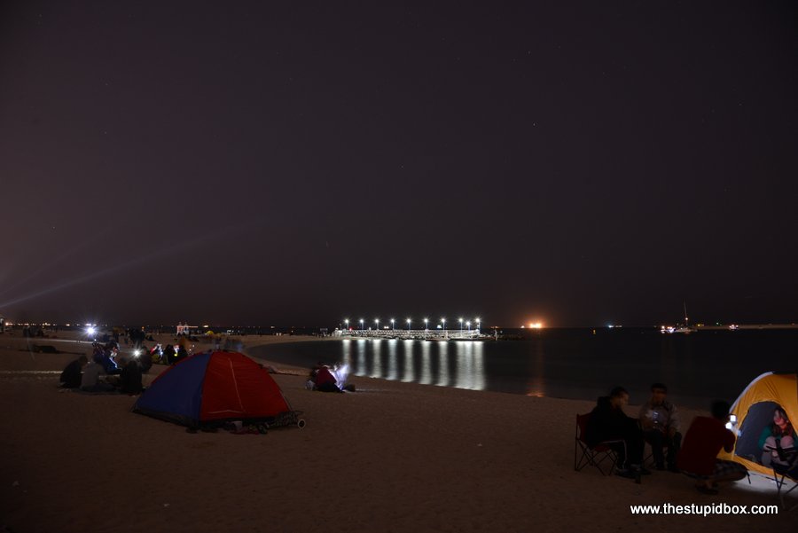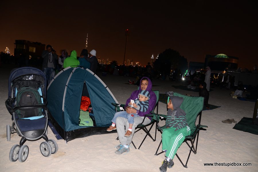 Initially the place looked little secluded and with doubt, parked the car. Then roamed around. In one hour, few tents were formed. We put up our tent. It was very cold temp. around 16-18 degrees. As the time nears, the parking space was jam-packed. We thought fireworks from all the places (Burj-Khalifa, Burj-Al-Arab and world island) starts at the same time. Took a good nap for around 1.5 hrs. The display at World Island lasts for 6 mins. I thought to take pictures of Burj-Khalifa first. B’cos of the crowd 10-mins before the display start, could see only heads. Ran toward the parking space to get the better view of Burj-Khalifa. One gentleman guided us that the first display is on the World Island and Burj-Khalifa will be the last. So I came back running to our tent area to get the World Island display clearly. I didn’t know this guy is an idiot until the first firework display cracked from Burj-Khalifa.